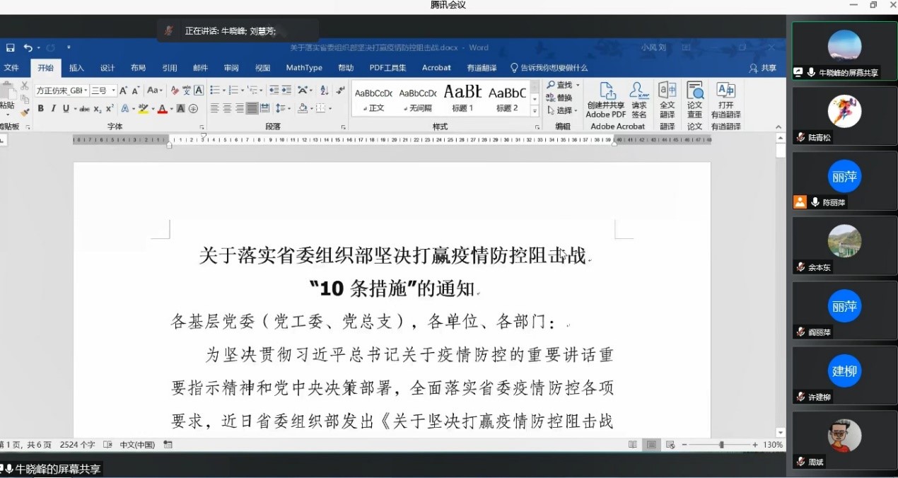 4月13日下午,VSport教师第一党支部在牛晓峰书记的带领下,通过网络会议的形式集中学习了省委组织部发出《关于坚决打赢疫情防控阻击战若干措施的通知》和公司党委发出的《关于在疫情防控工作中充分发挥党组织和党员干部作用的通知》。