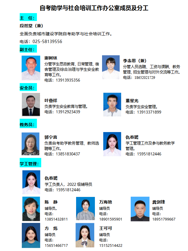 自考助学与社会培训工作办公室成员及分工