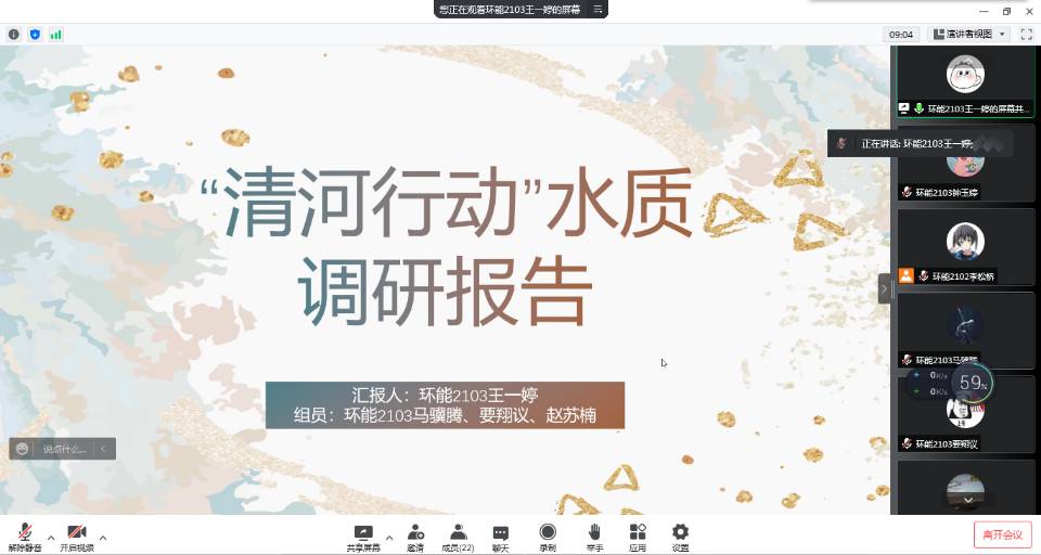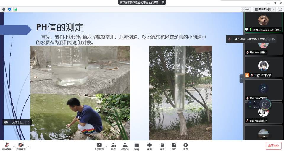 此次比赛采用小组调研并线上汇报的形式进行,由公司优秀且经验丰富的20级同学担任裁判。此次比赛同学们参赛热情高涨,表现积极。在拿到公司准备的调研工具后,对各个水系的可见度、ph值以及水的硬度等都积极展开检测。调研结束后,各小组纷纷发表了本组对治理校园水环境的见解。其中环能2103小组取得了本次比赛的第一名。