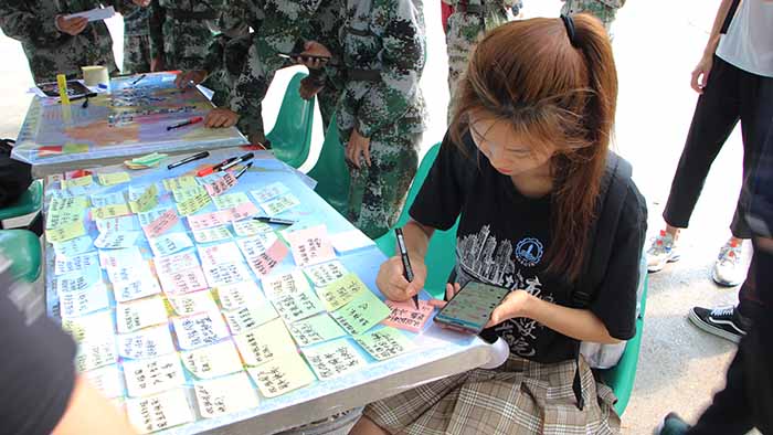 活动伊始,参与的同学们在自己事先准备的一寸照和家乡特色照片上写下家乡的地址,并将照片精心的贴在中国的地图上,以爱心、红旗等特殊的图标向他人展示中国不同地区的风貌。随后,同学们积极地在便利贴上写下对祖国的祝福语,在新中国七十周年华诞之际寄托对祖国母亲美好的愿望,并将其贴在世界地图上。地图上充满了同学们的衷心祝福,活动也随之结束。