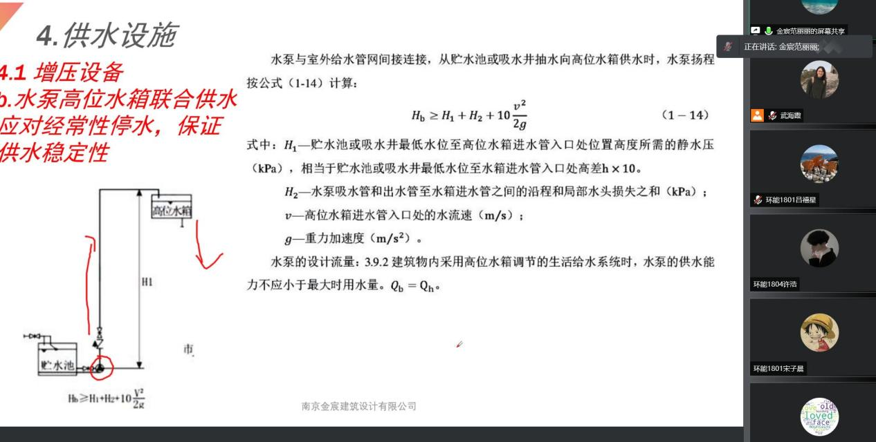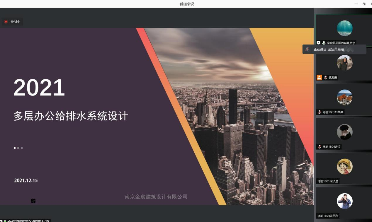 2021年12月15日上午,在建筑环境与能源应用工程专业18级同学进行建筑给水排水课程设计期间,暖通工程系邀请南京金宸建筑设计有限公司范丽丽高级工程师开设线上讲座。范工结合多年的工作经验为同学们介绍了多层公用建筑的给水排水工程设计,包括规范的使用要点,管线的布置及计算等。此外,还结合工程实例介绍了设计要点和注意事项,并为同学们提供了详细的参考资料。