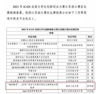 在刚刚落幕的2021年iCAN全国老员工创新创业大赛江苏浙江赛区比赛中,由公司姜明瑞、郭讯、廖禹、张彪、陈阿祥五名同学组队,蔡浩教授和王瑜副教授共同指导的“嗅探精灵—洁净厂房空气环境可视化与溯源技术领航者”项目荣获赛区一等奖,并晋级全国总决赛。