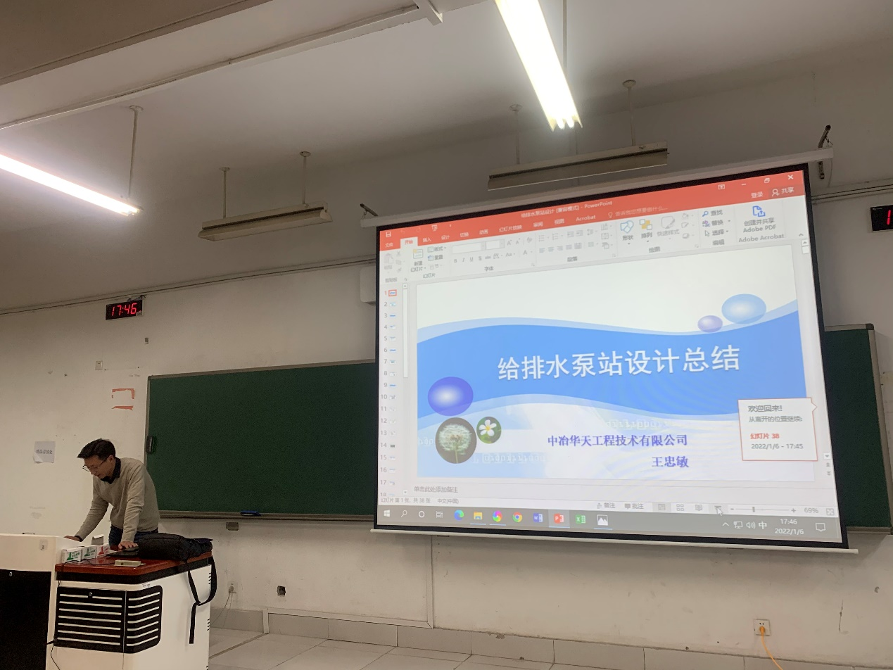 2022年1月6日下午16:30在仁智楼416,在进行《水泵及水泵站》课程设计中后期,就职于中冶华天工程技术有限公司的王忠敏所长,应邀给给排水科学与工程专业19级同学们进行了《水泵及水泵站》课程设计讲座。