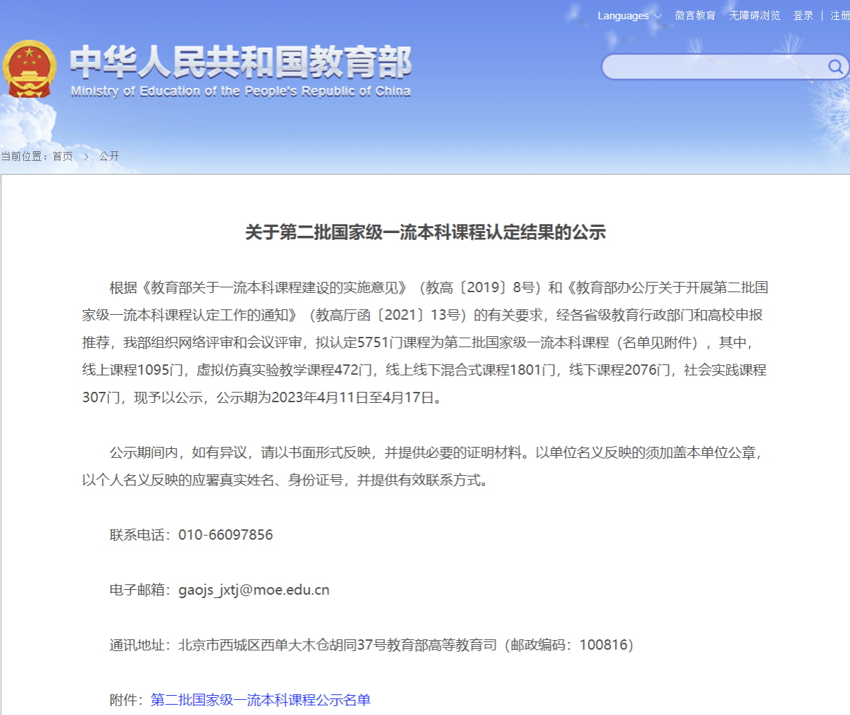 教育部一流本科课程“双万计划”是我国建设高质量本科教育的重要抓手,旨在打造一批具备高阶性、创新性和挑战度的优质课程,树立课程建设新标杆,实现课程质量全面提升。本次教育部拟认定5751门课程为第二批国家级一流本科课程,含线上课程1095门,虚拟仿真实验教学课程472门,线上线下混合式课程1801门,线下课程2076门,社会实践课程307门。