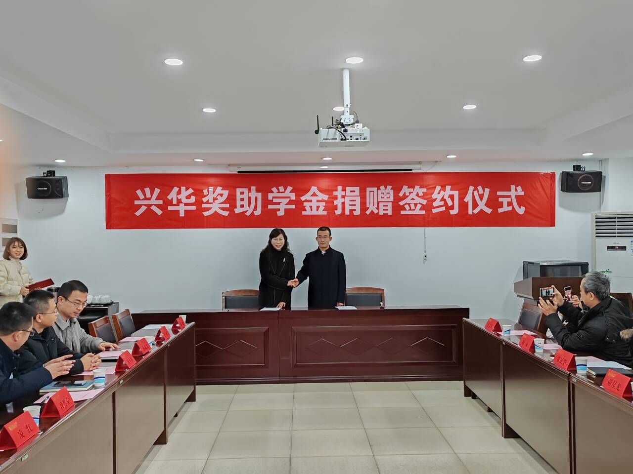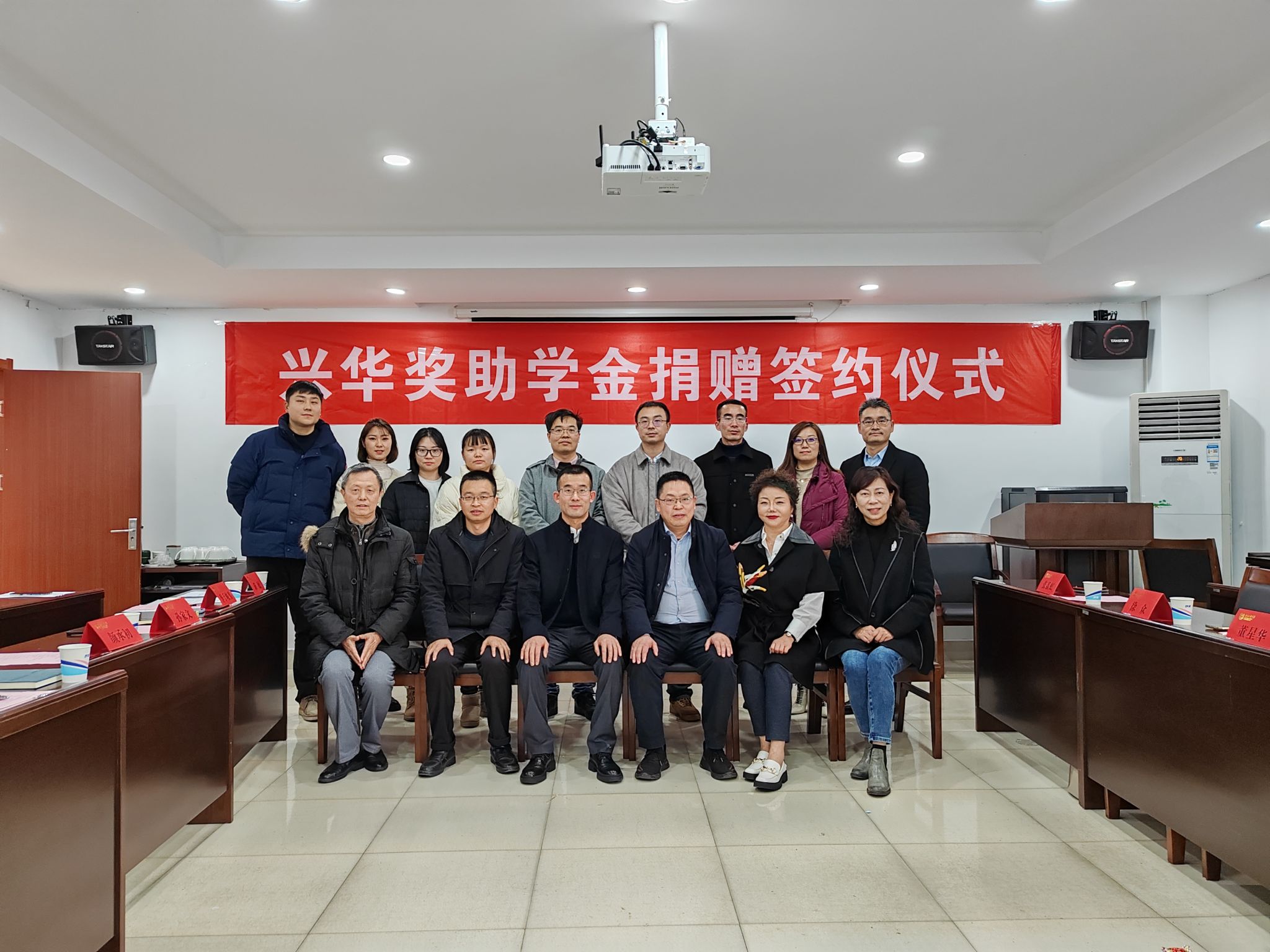 1月5日下午,公司在天工楼302A会议室举办兴华奖助学金捐赠签约仪式。江苏兴华教育科技有限公司董事长董星华、总经理董星光及民盟江苏省委直属文化第一支部与南京市徐州商会相关代表,对外合作与发展处副处长凌红,公司党委书记段然堂、经理颜承初、党委副书记孙家文与公司师生代表参加活动。