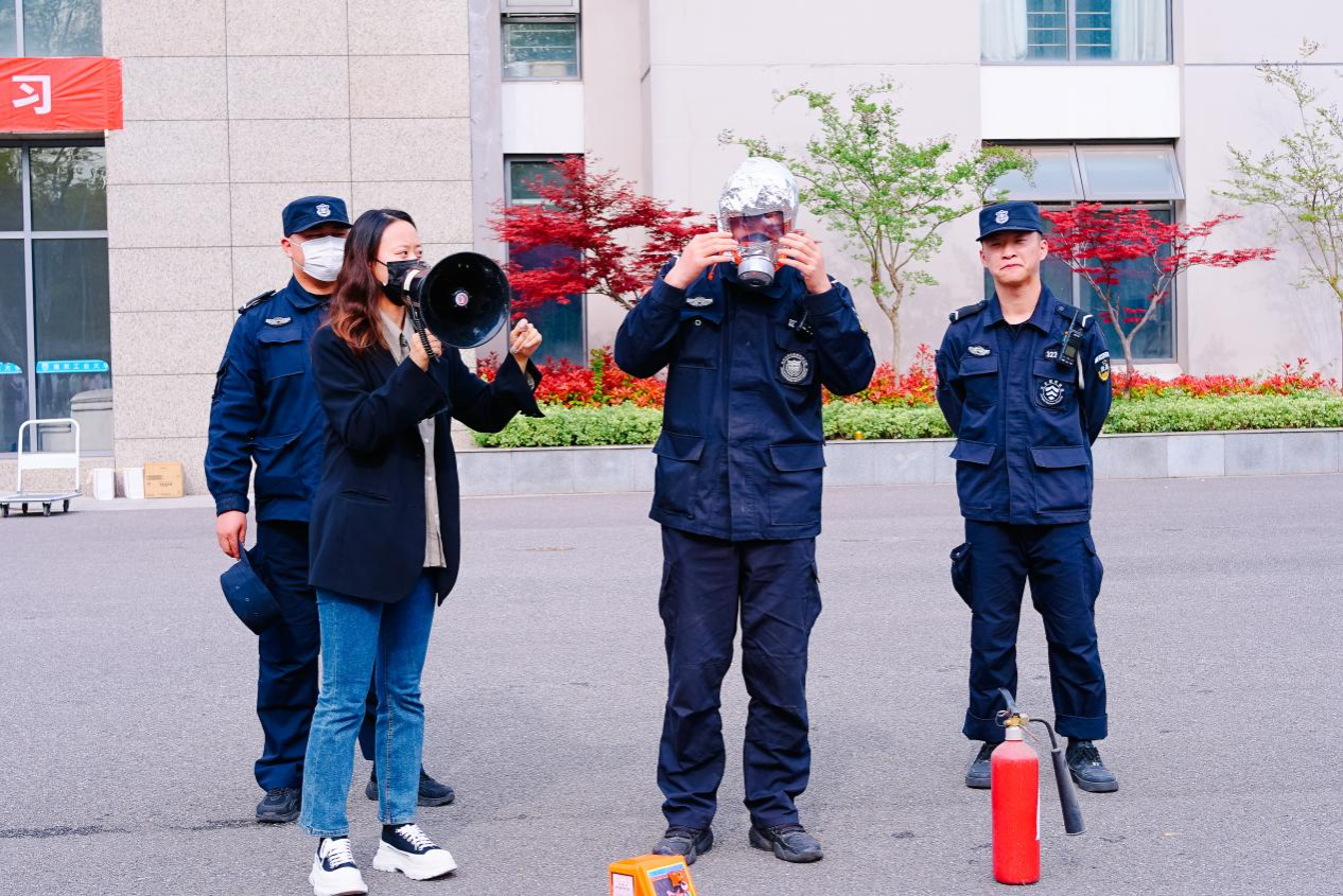 会议结束之际,消防警报声响起,六个公司的师生代表进行应急疏散演练,并开展消防演习。在演习前先进行了消防知识的趣味问答环节,与会人员积极参加,气氛热烈。演习中包括消防防毒面具、灭火毯和灭火器的使用说明培训和现场实操。