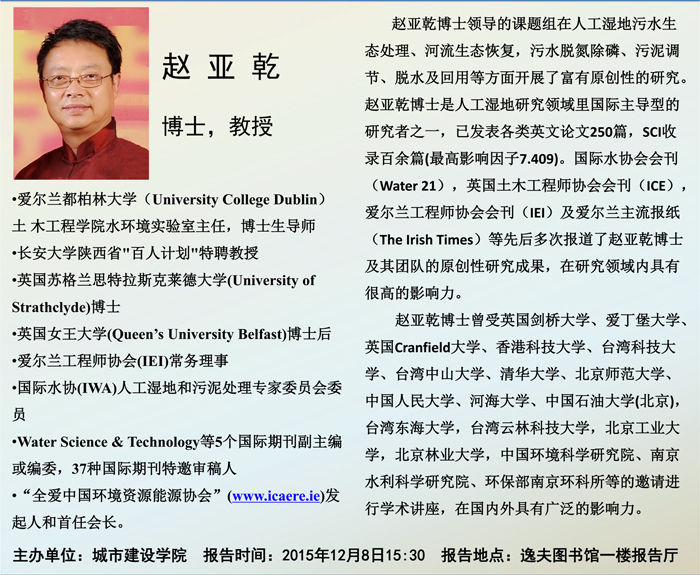 爱尔兰都柏林大学赵亚乾教授讲座通知