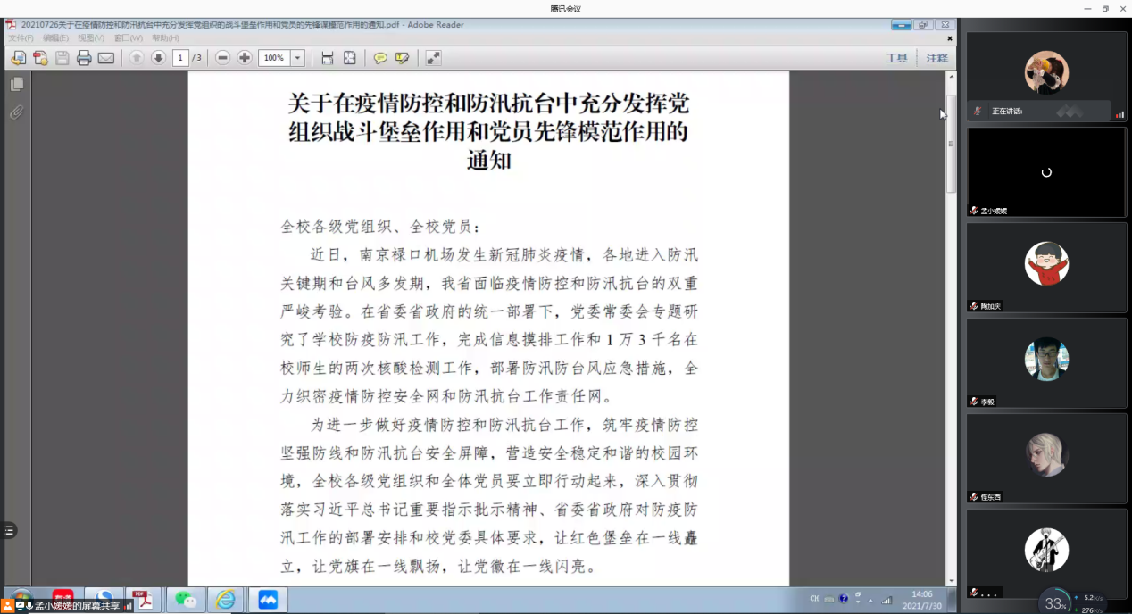 2021年7月30日下午14时,VSport市政研究生党支部开展专题会议,组织共同深入学习《关于在疫情防控和防汛抗台中充分发挥党组织战斗堡垒作用和党员先锋模范作用的通知》。
