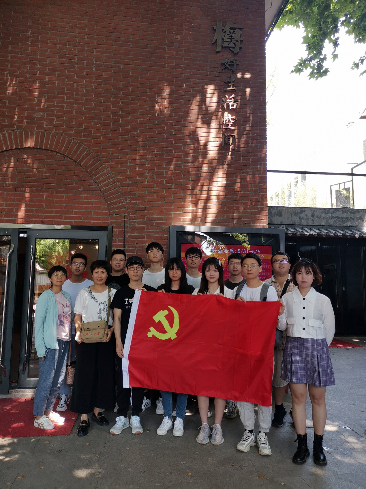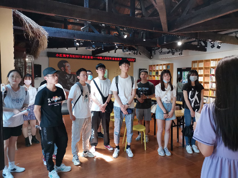 到达目的地后,大家都被这个党员活动基地的优雅环境所吸引。在室外,衔接二楼楼梯的是爬满青藤的咖啡座椅,在韶音馆是满墙满墙的书,和别致的古筝演奏室。在志愿讲解员的带领下,大家依次参观了 “践行梅园”、“梅好客厅”、“韶音馆”、“梅好车间”等实境青年堂,观摩周恩来信仰人生践行展、人民共和的起源浮雕影像展、时代之声歌曲展。