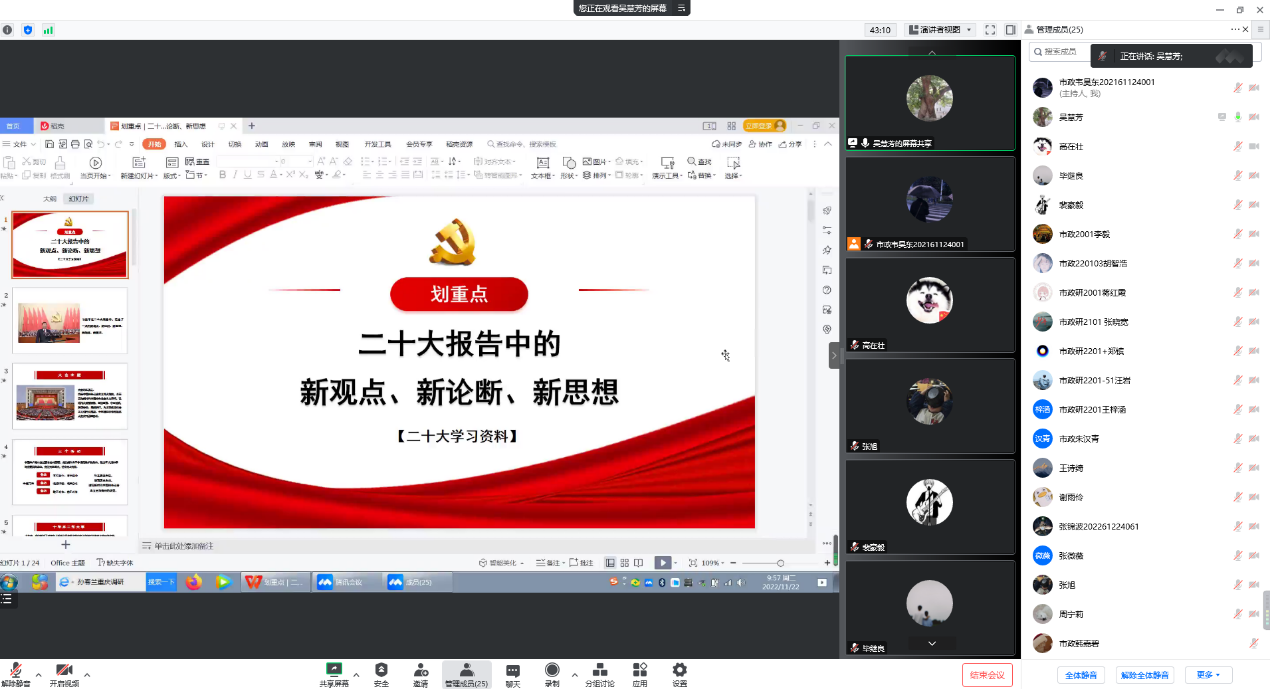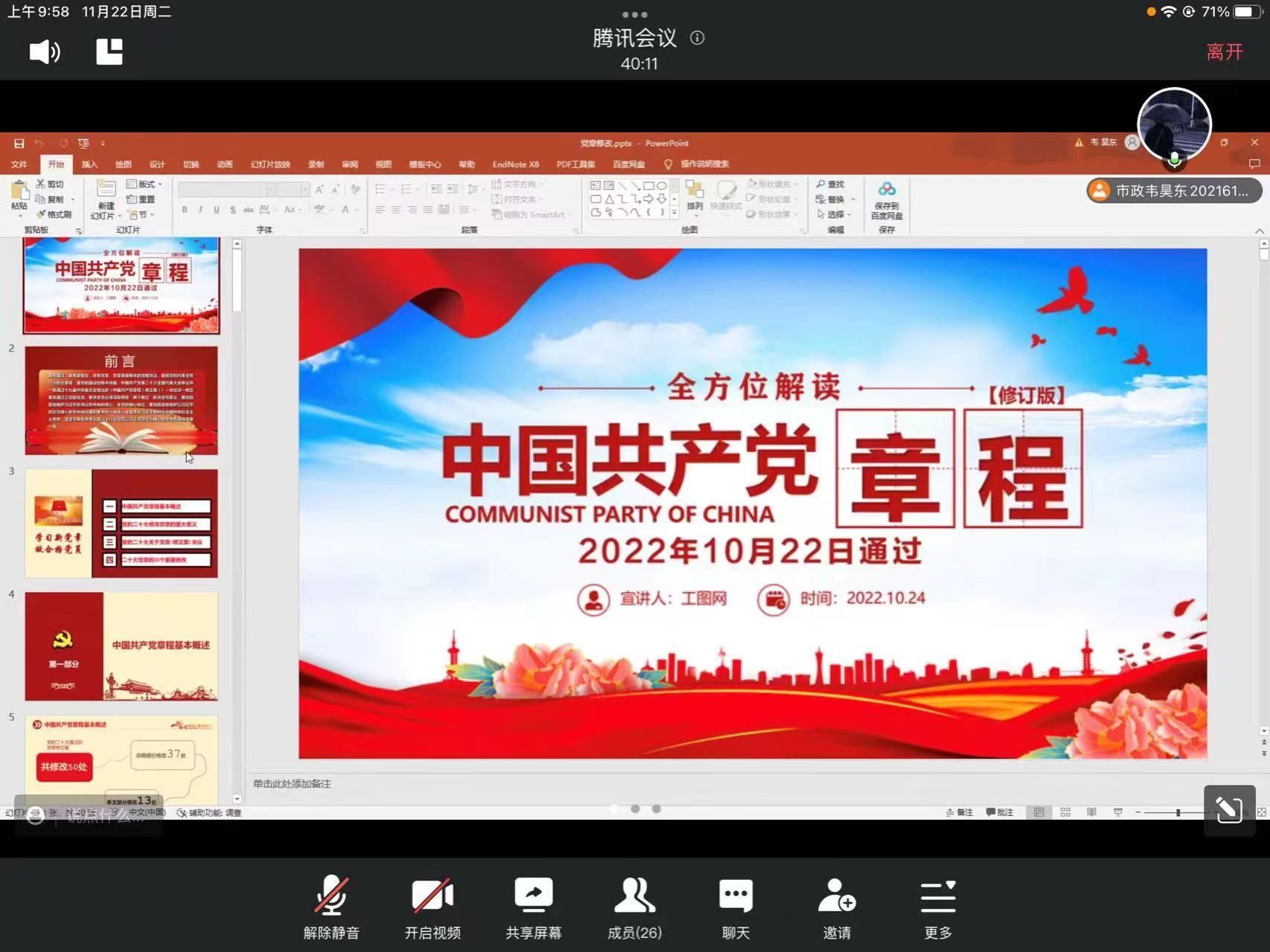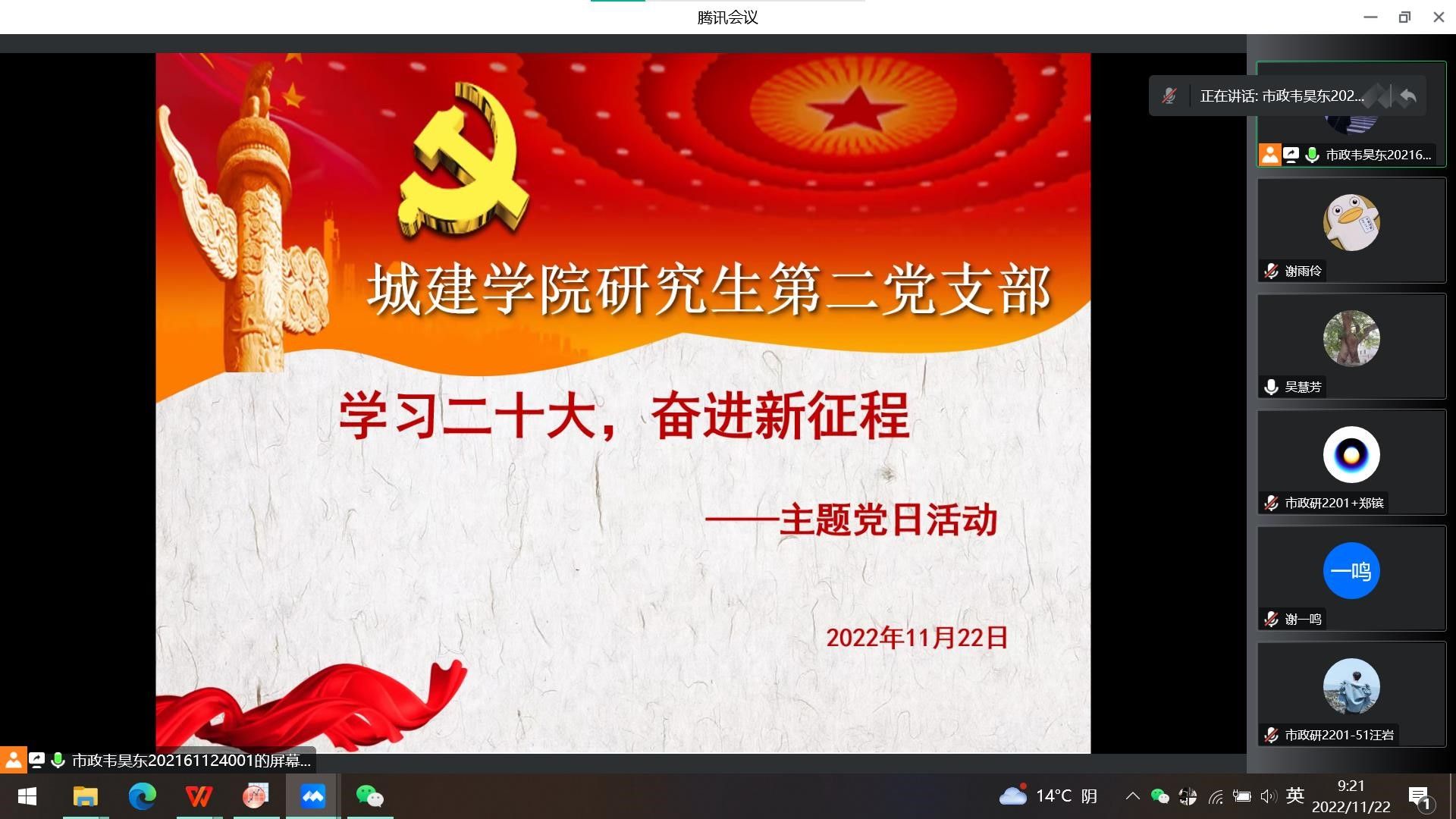 VSport市政研究生党支部于11月22日举行在线会议,学习党的二十大报告和大会通过的《中国共产党章程(修正案)》,激励支部党员增强政治自觉思想自觉行动自觉,把思想和行动统一到党的二十大精神上来。本次活动支部全体党员参加。