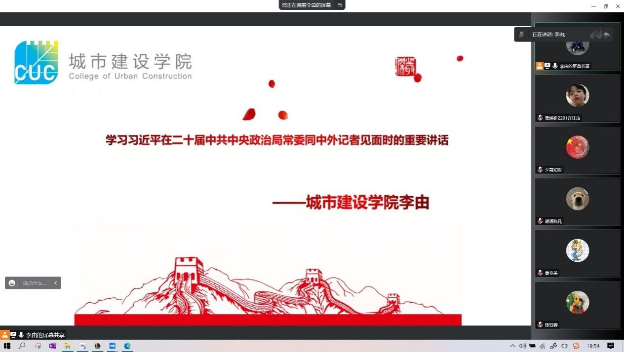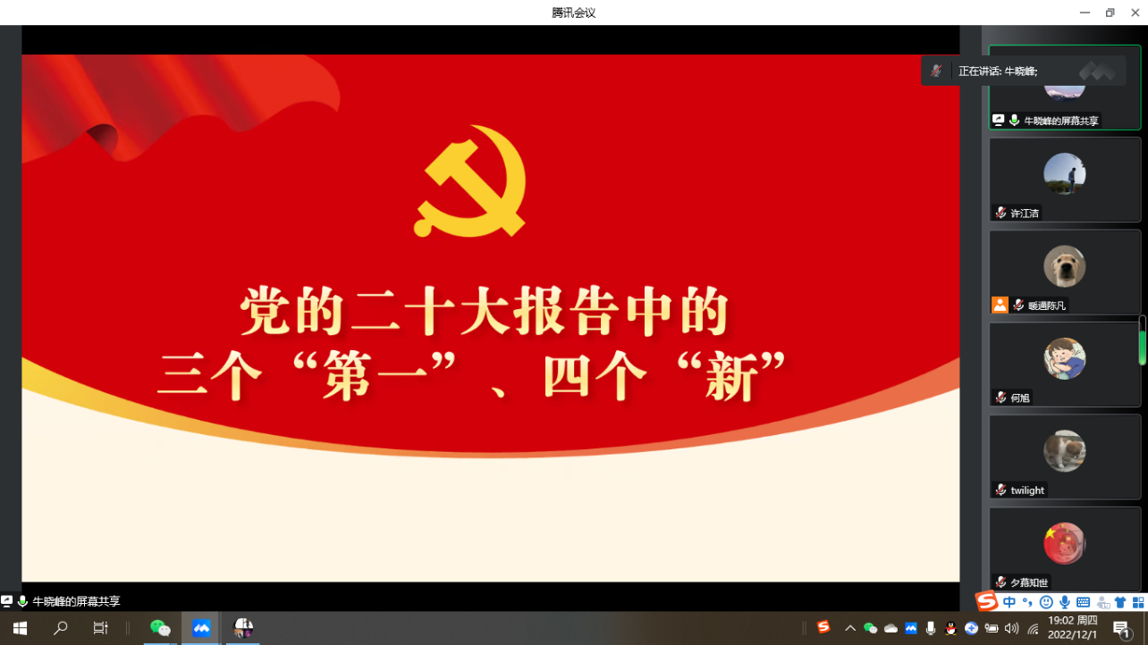 首先,牛晓峰同志关于二十大精神学习做了整体汇报,对大会主题举什么旗帜、贯彻什么思想、弘扬什么精神给出了深刻的理解,并着重介绍了三个“第一”、四个“新”的重要性,告诫我们必须坚定不移听党话、跟党走,怀抱梦想又脚踏实地,立志做有理想、敢担当、能吃苦、肯奋斗的新时代好青年。接着陈凡副书记带领大家对修改后的党章进行学习探讨,提出了如何做好新时代的合格共产党员;最后,李由书记就习近平总书记在二十届中共中央政治局委员同中外记者的重要讲话做出诠释,更是希望我们要埋头苦干、担当作为,以更加强烈的历史主动精神推进马克思主义中国化时代化,奋力实现中华民族伟大复兴的中国梦。