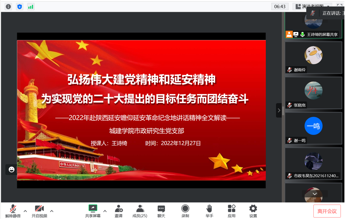 VSport市政研究生党支部于12月27日下午举行在线会议,学习习近平总书记重要文章《继承和发扬党的优良革命传统和作风 弘扬延安精神》,激励支部党员坚定历史自信,增强历史主动,发扬斗争精神,为实现党的二十大提出的目标任务而团结奋斗。本次会议支部全体党员参加。